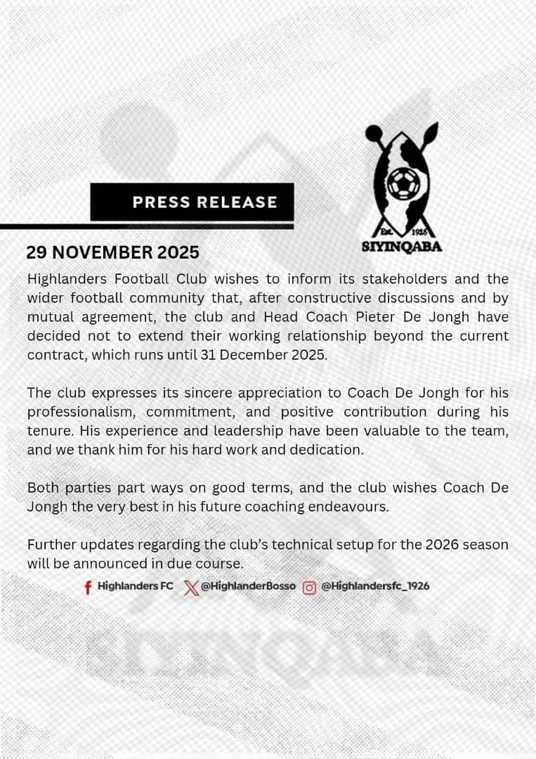 Highlanders Football Club has confirmed that head coach Pieter De Jongh will leave the club when his contract expires on December 31, 2025. The decision was reached after constructive…